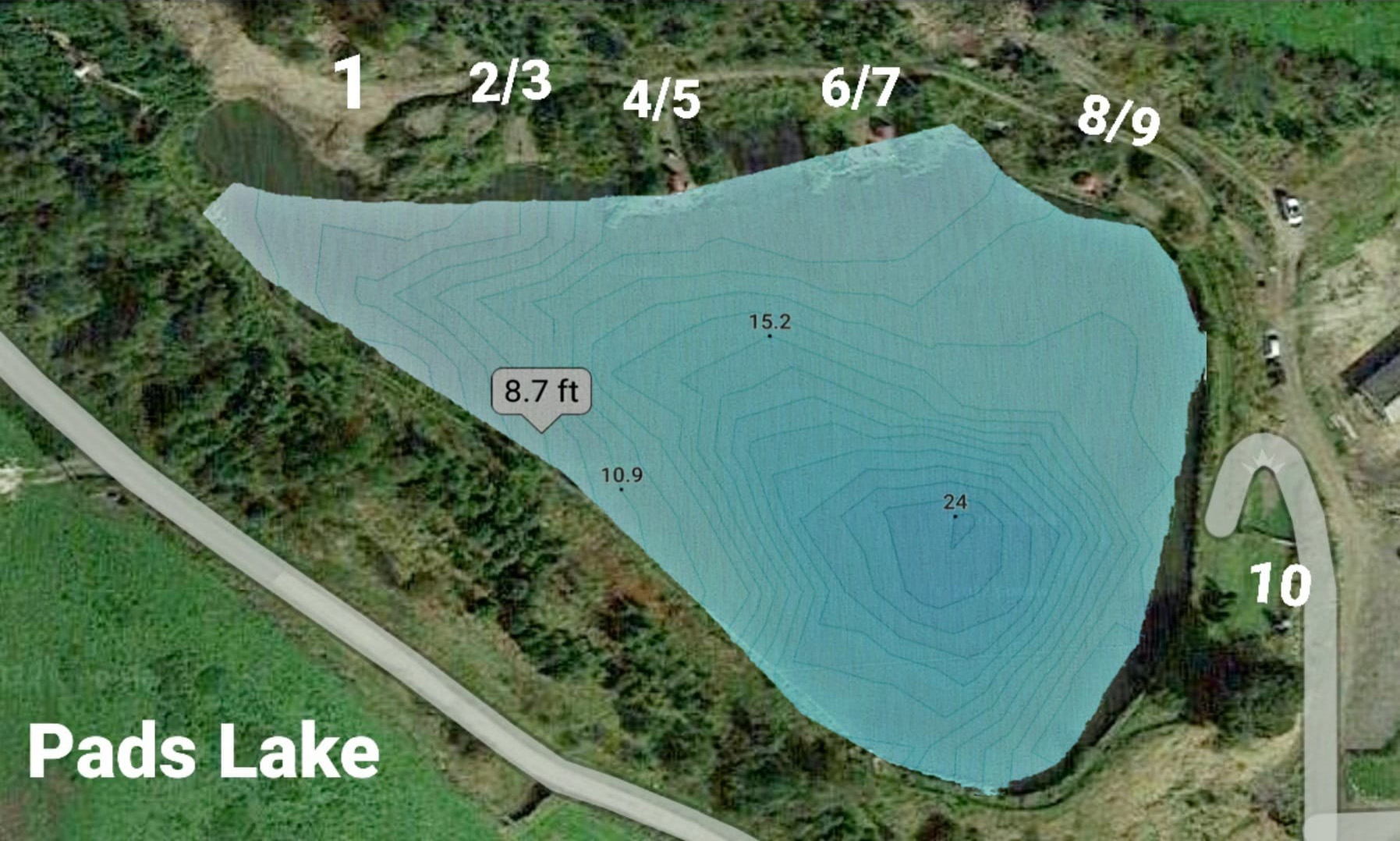 The water comprises of 10 pegs with a number of double pegs. It is around 3 acres in size with depths from 3 to 25ft in part. All the pegs have been layered with stone then wood chip, and are easily accessible.